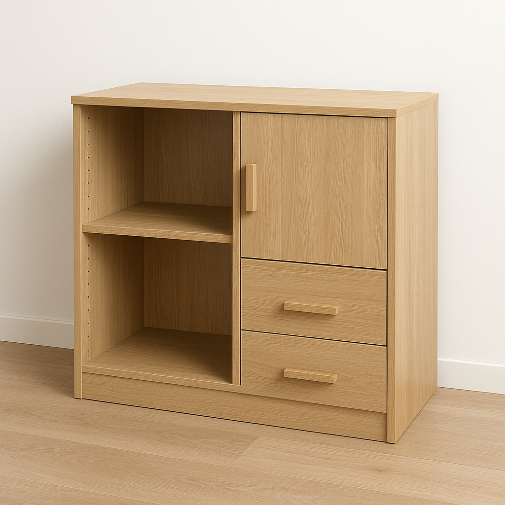 „Medžio Prisilietimas“ – nedidelė, bet funkcionali komoda, kuri puikiai tinka tiek mažesnėms erdvėms, tiek kaip papildomas baldas prie didesnių komplektų. Atviros lentynos suteikia vietos knygoms, dekoracijoms ar kasdieniams daiktams, o spintelė ir du stalčiai užtikrina tvarkingą saugojimą. Šviesi medžio tekstūra spinduliuoja natūralumą, o minimalistinis dizainas lengvai dera prie įvairių interjero stilių.