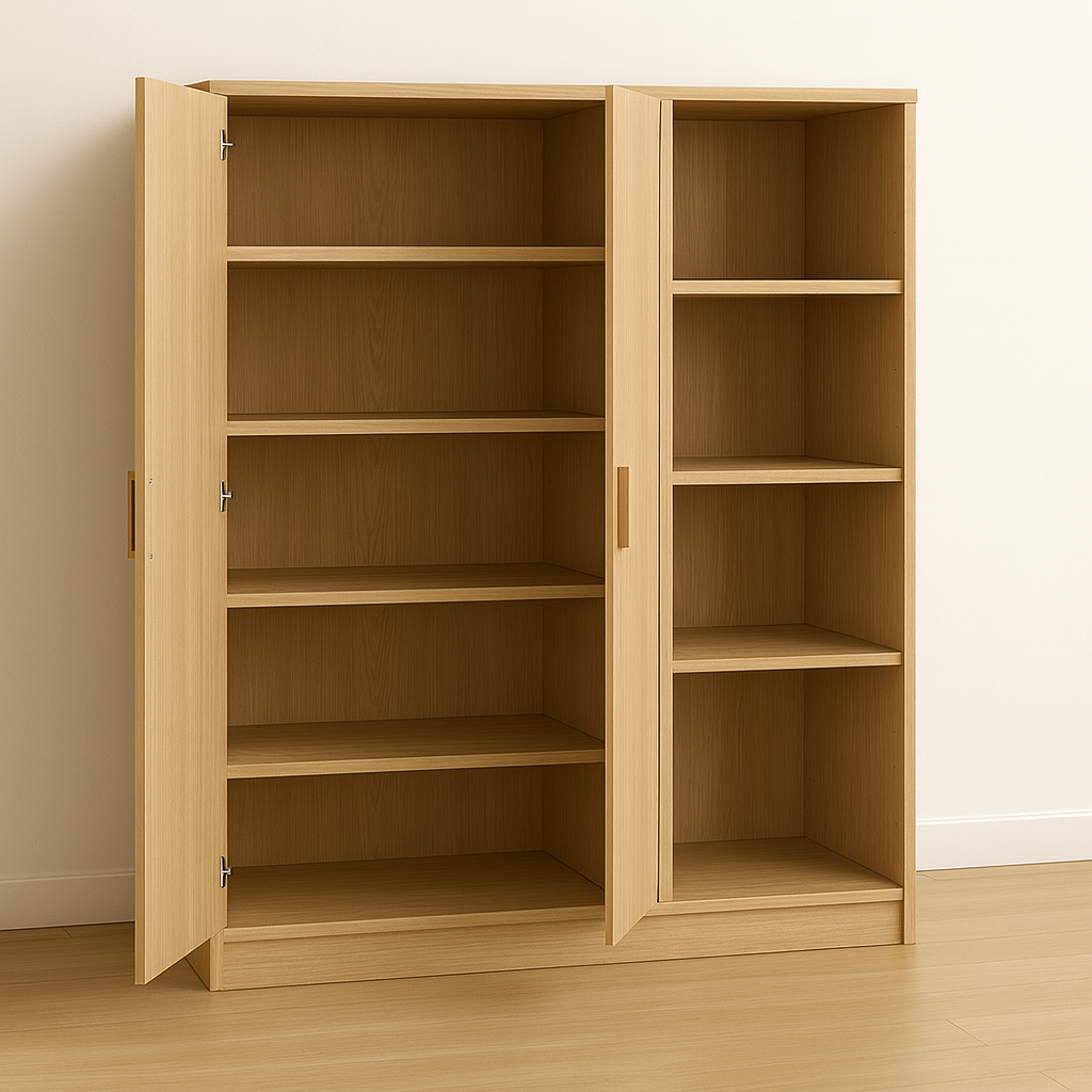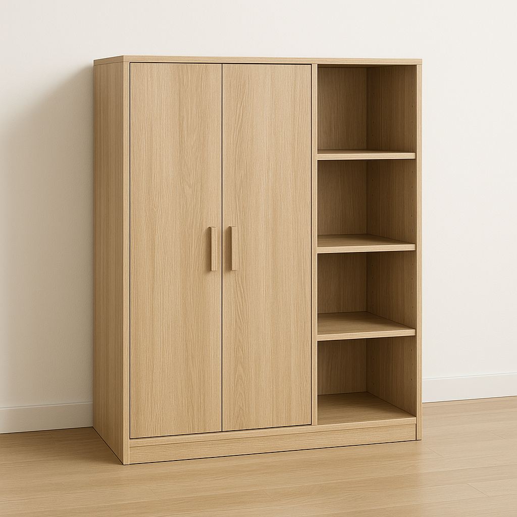 „Rytmečio Šešėlis“ – kompaktiška, bet funkcionali spinta, kurioje dera uždara erdvė drabužiams bei atviros lentynos daiktams ar dekoracijoms. Toks dizainas leidžia baldą pritaikyti įvairiose erdvėse – nuo miegamojo iki darbo kambario. Šviesi medžio tekstūra suteikia interjerui šilumos, o minimalistinės linijos išlaiko modernų, švarų stilių.